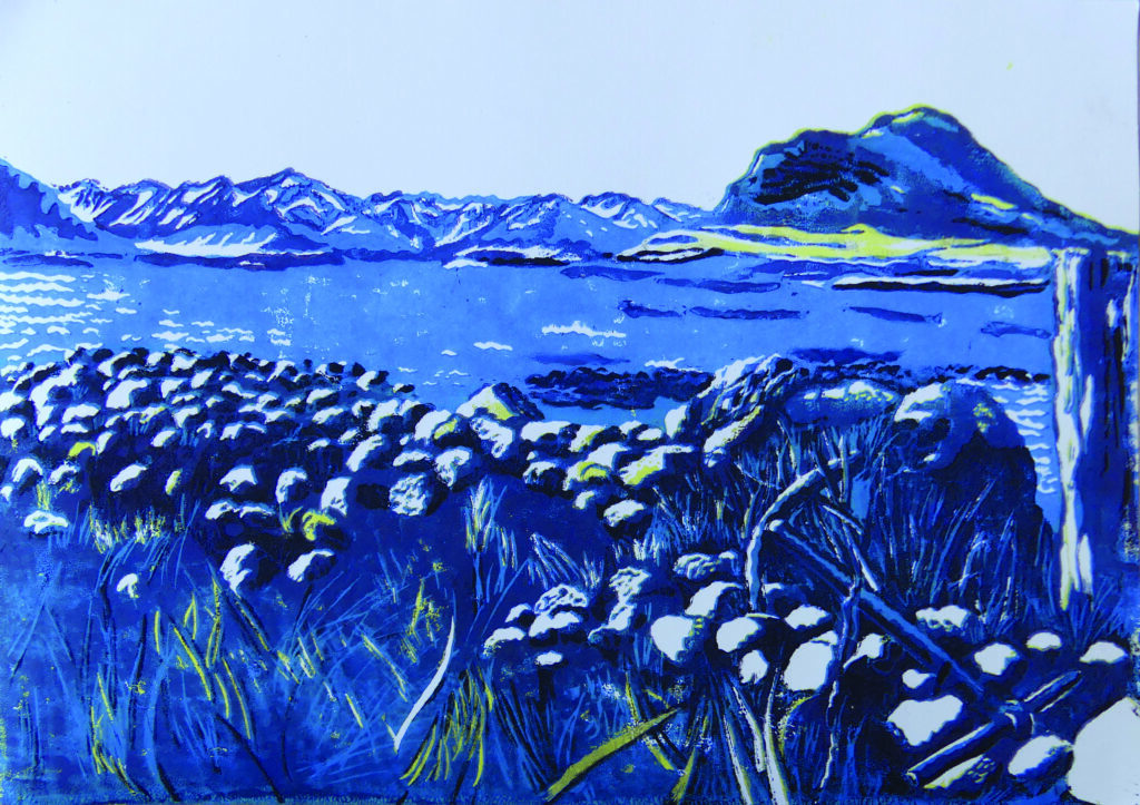 Sylvie DONAIRE présente un travail d’étude, réalisé en linogravure à plaque perdue sur le terrain, imprimé au baren, en résidence à Solvellir, Nupúr, en Islande, dans les fjords du Nord-Ouest.